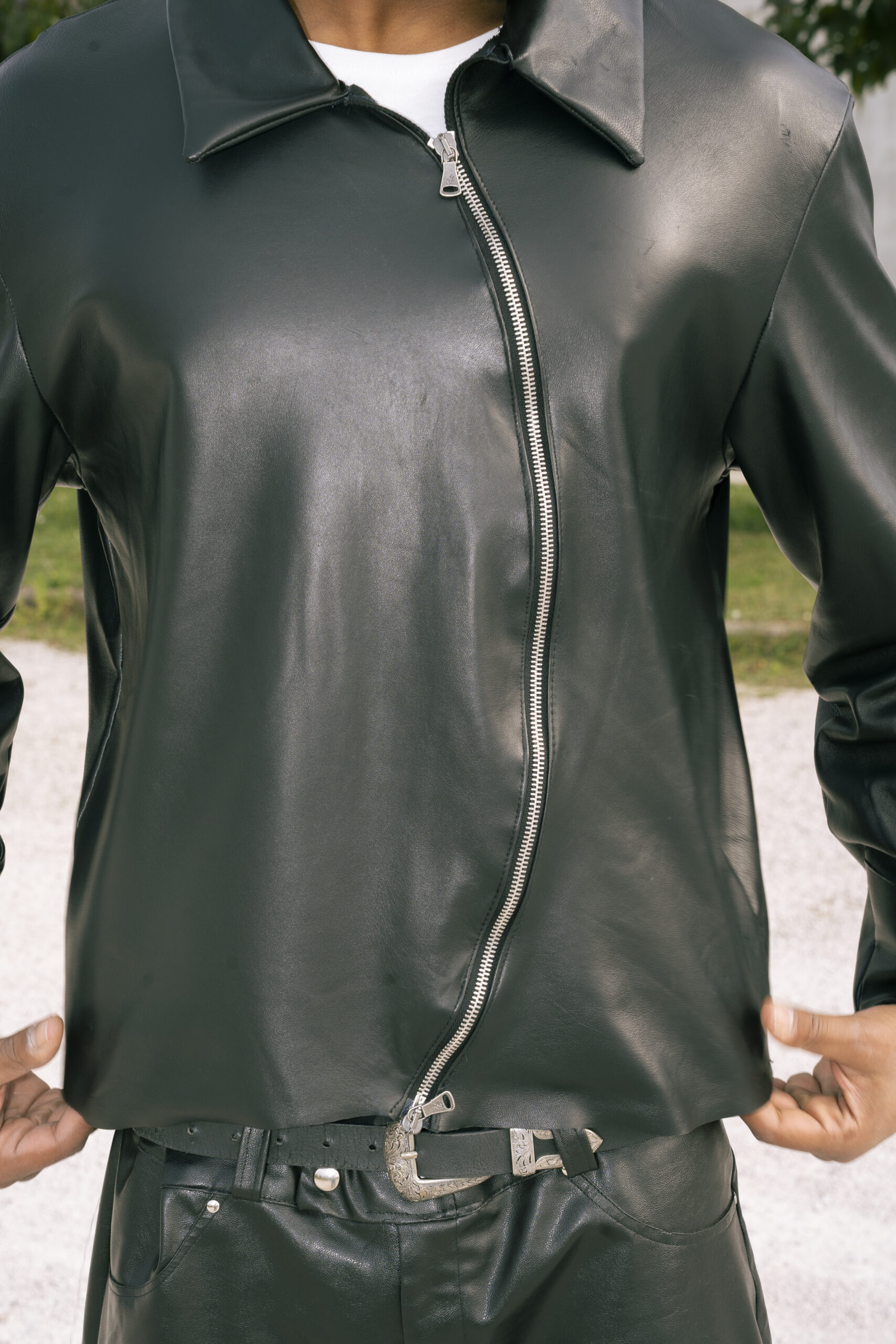 Crafted from soft lamb nappa leather, chosen for its silky texture and natural suppleness, the jacket envelopes the body with clean, sculptural lines. The rounded asymmetrical zip becomes the focal point of the design — an architectural detail that breaks symmetry with balance and sophistication, introducing movement and depth to the silhouette.