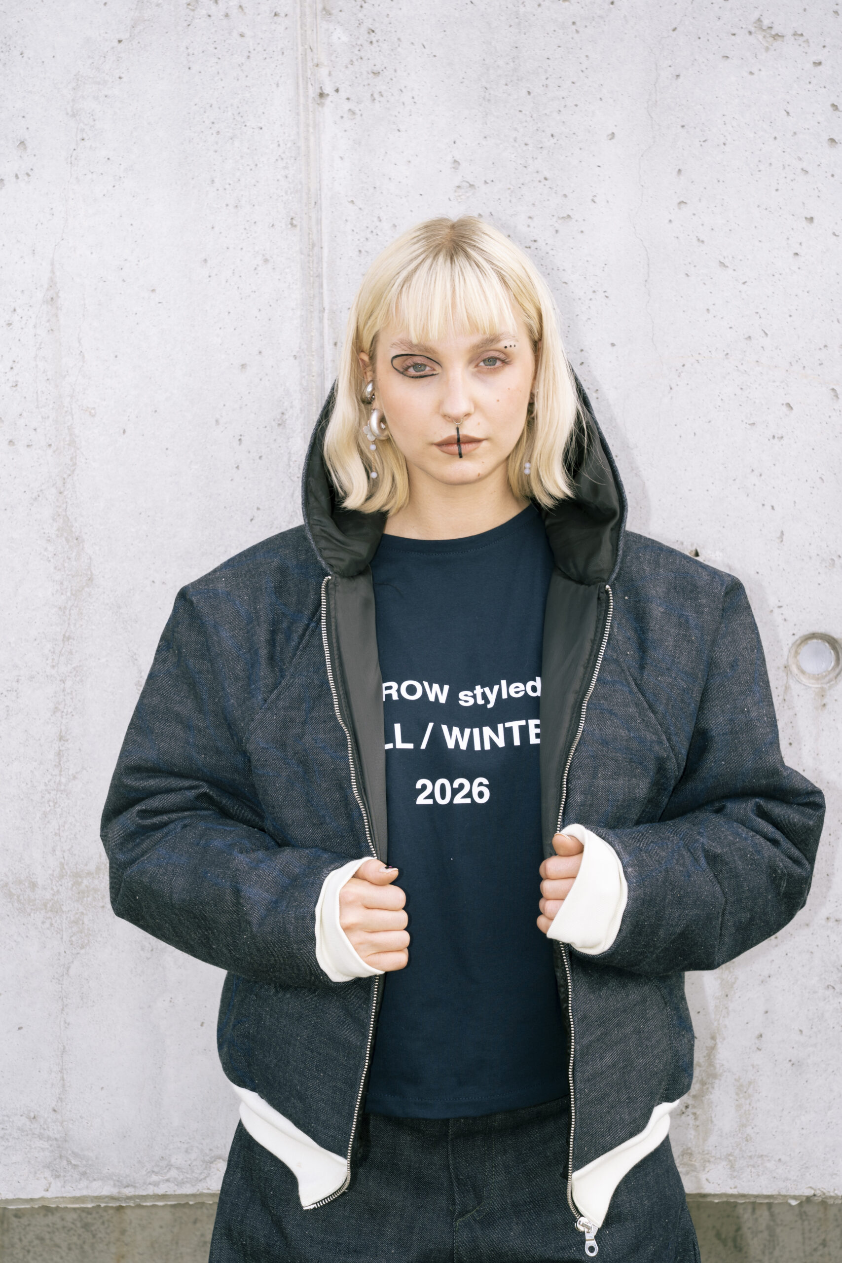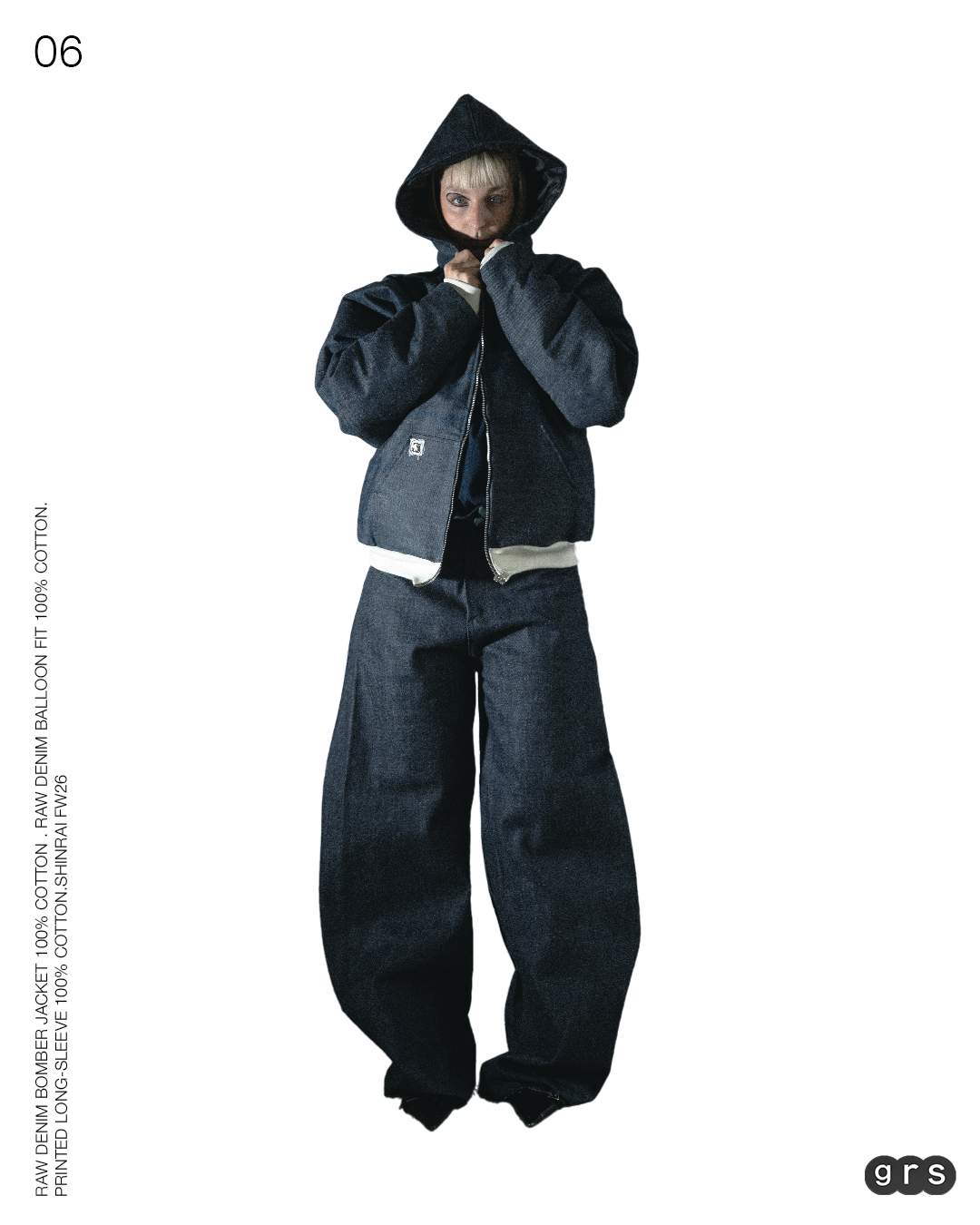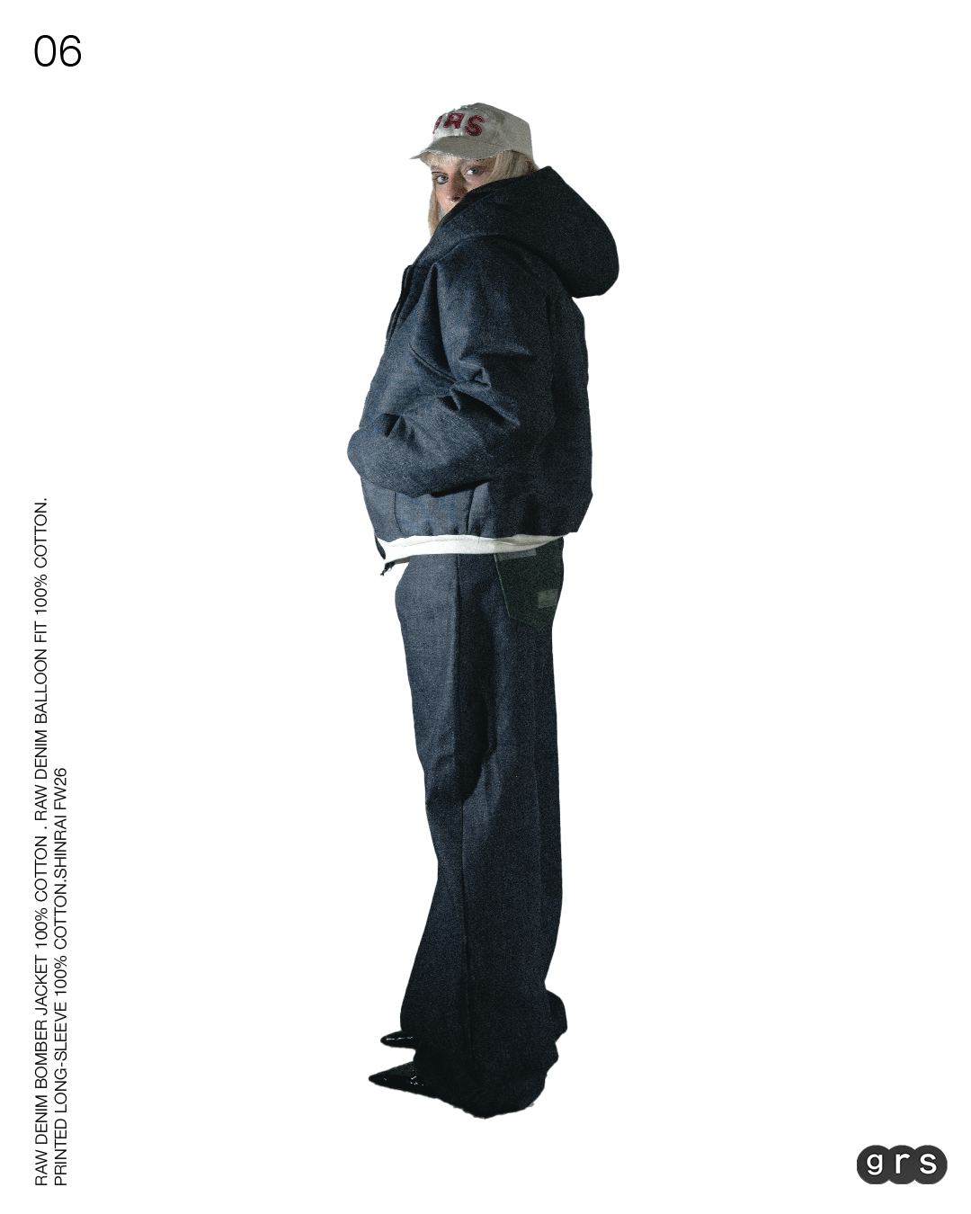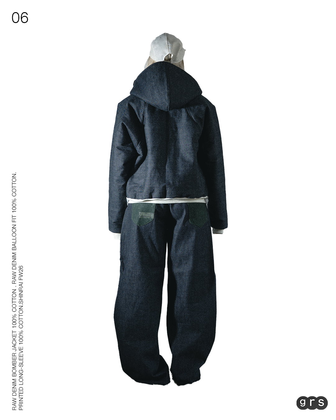 A defining element of the piece is the signature Growstyled raglan sleeve, a mark of identity that reinforces its authenticity and character. Every detail — from the denim stitching to the architectural cuts — is executed with millimetric artisanal precision, transforming a utilitarian garment into an expression of modern elegance.