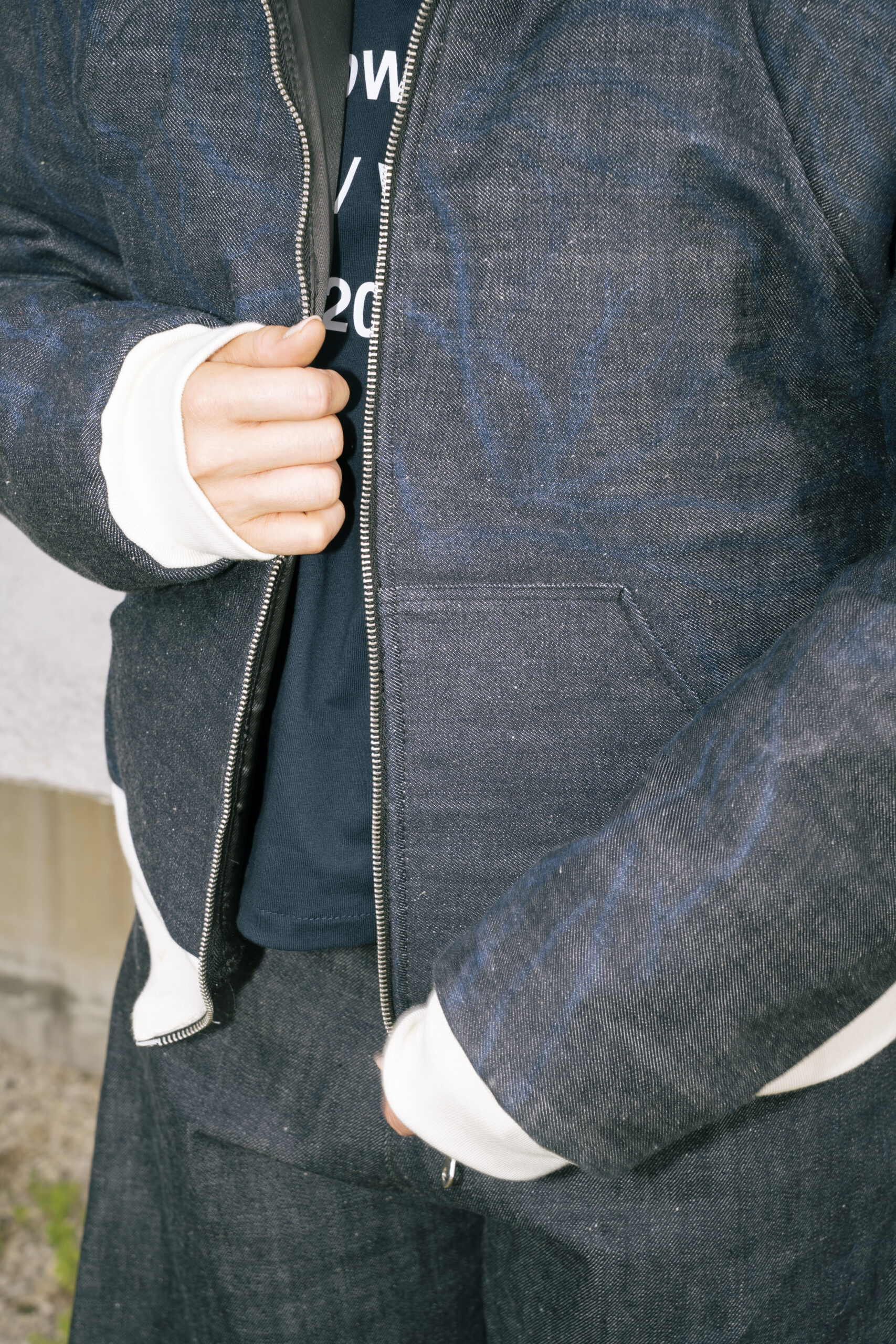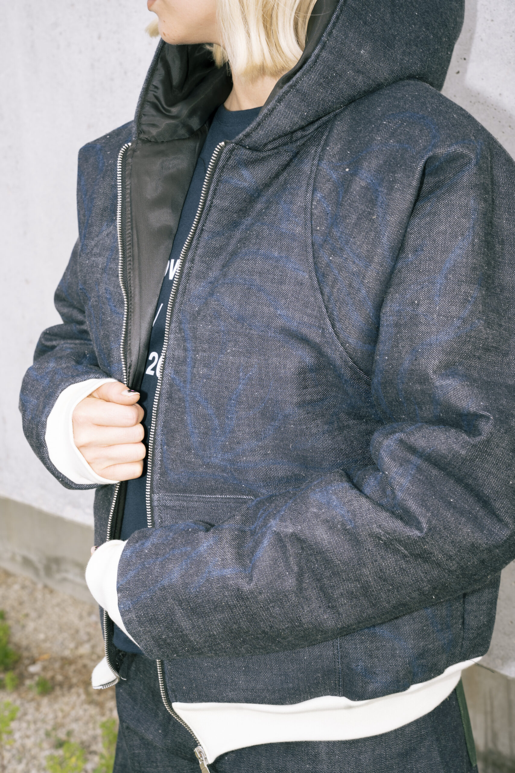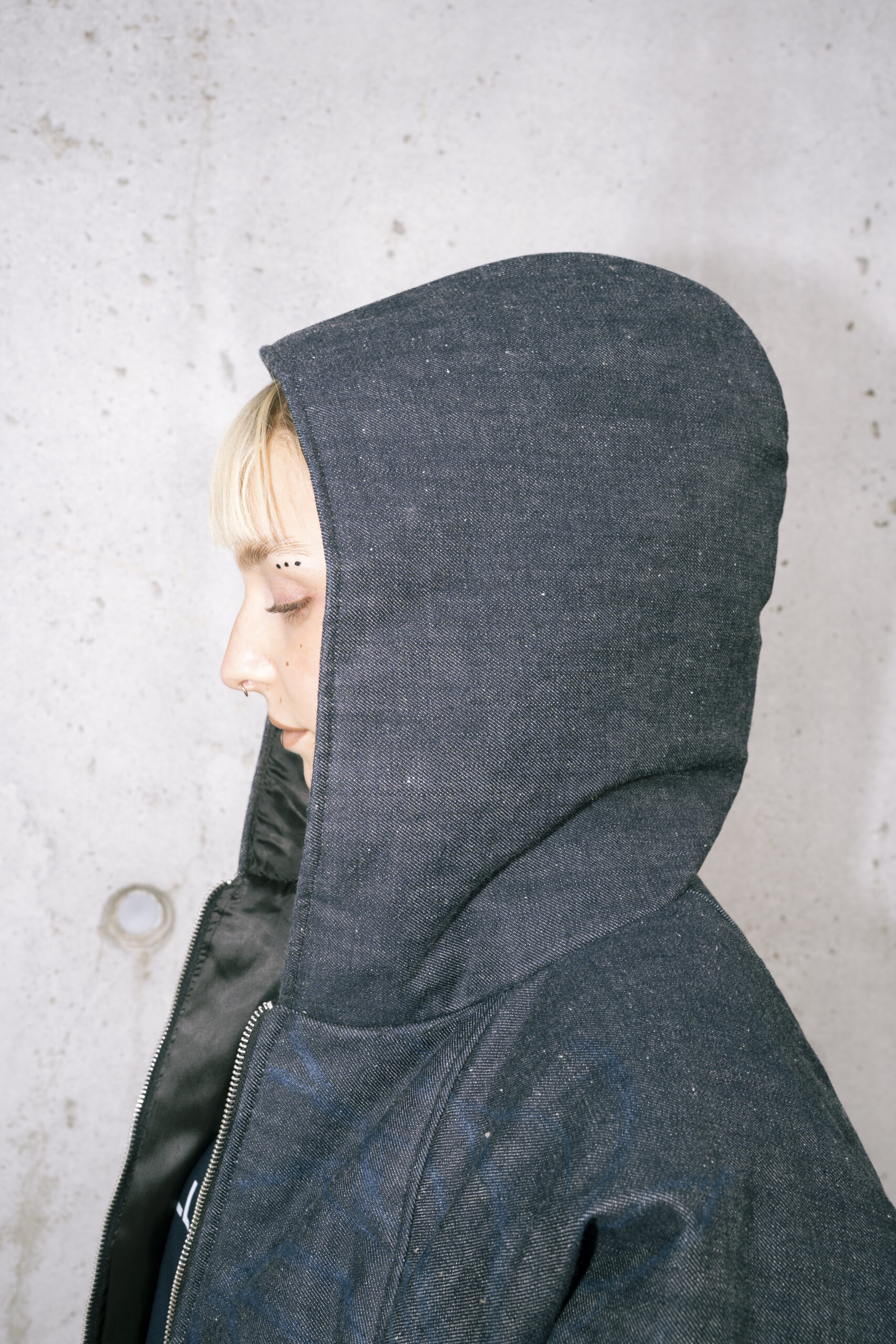 Crafted from 100% raw cotton denim, the jacket preserves the purity of the fabric in its most essential form — a living material designed to evolve over time and tell the story of its wearer. The raw texture, compact and resilient, contrasts beautifully with the padded interior and soft lining, creating harmony between structure and suppleness.