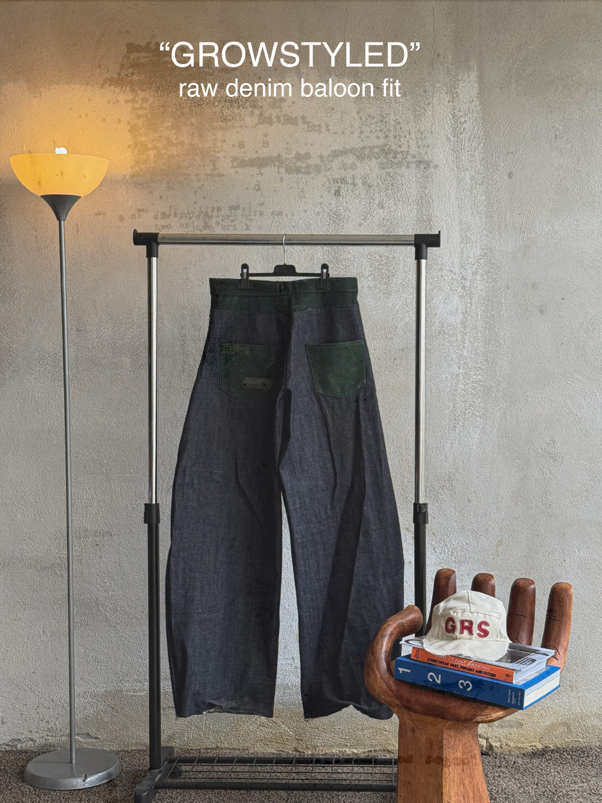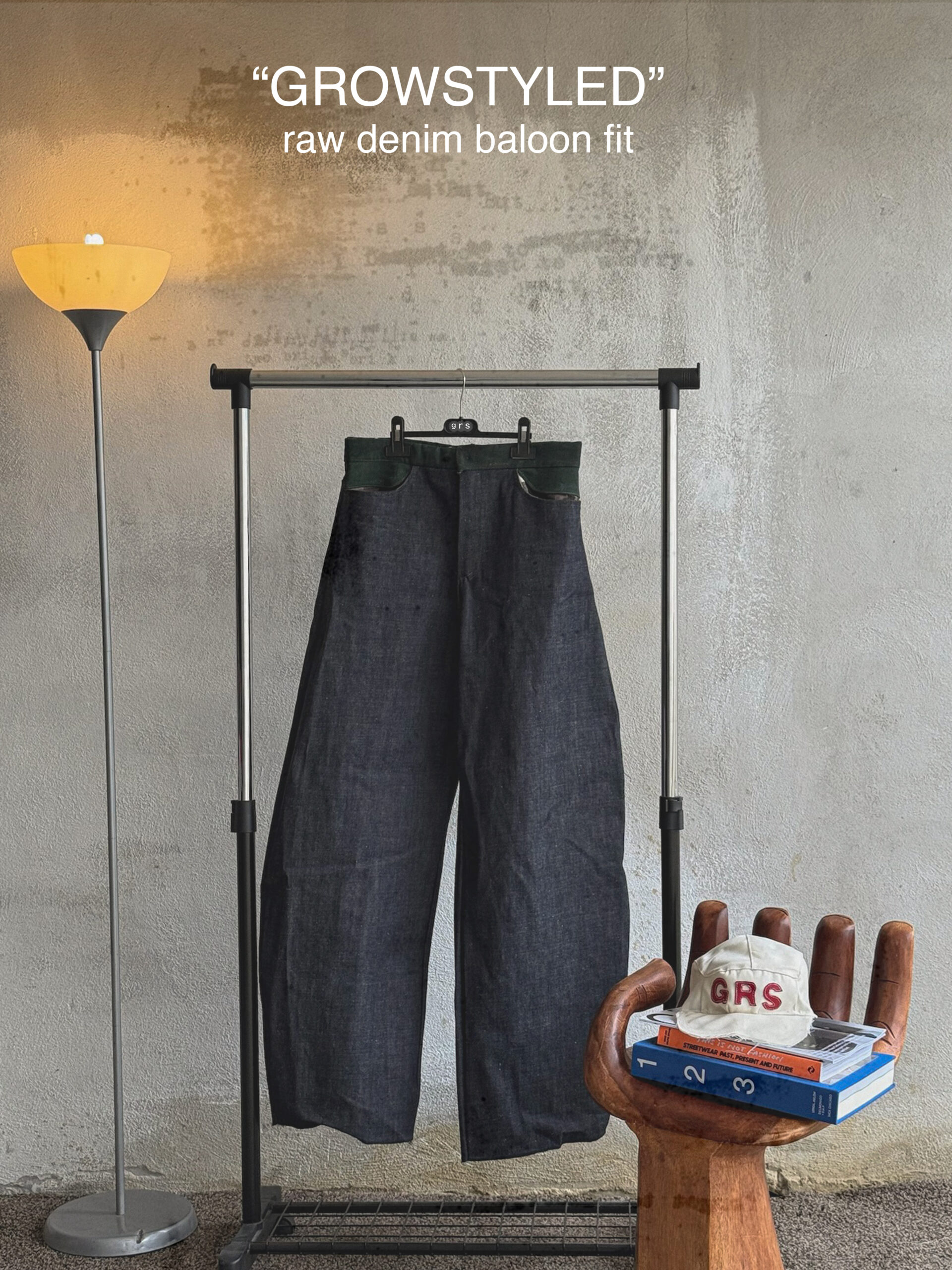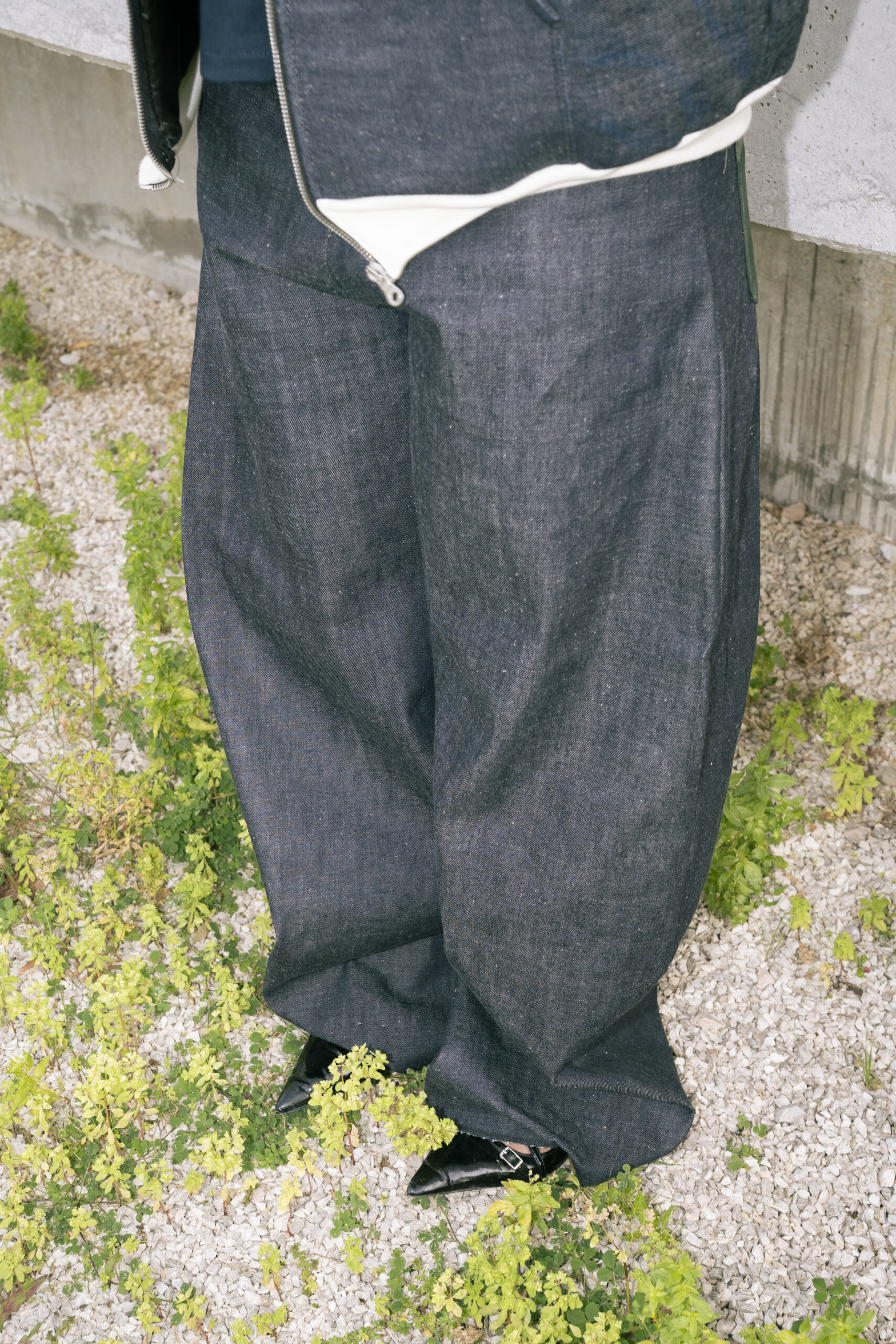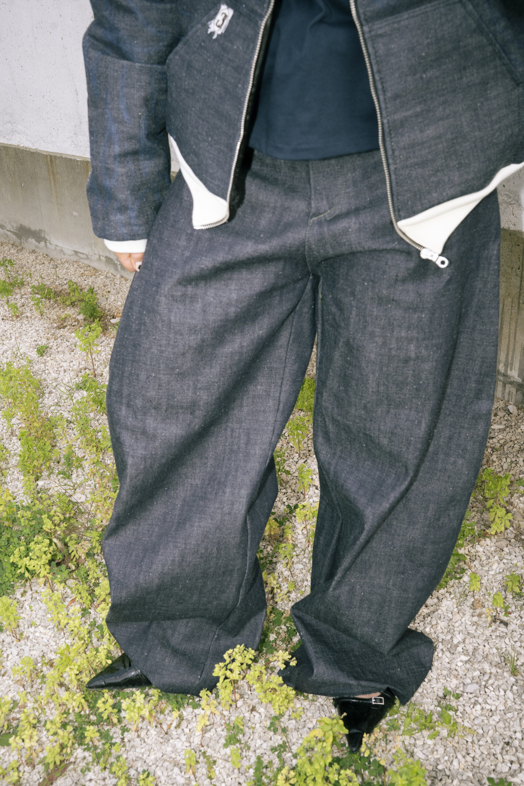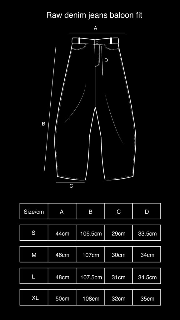 ENG: A piece born from the encounter between Japanese heritage and contemporary experimentation. The Raw Denim Balloon Fit Jeans reinterpret the structure of traditional nikkapokka workwear — known for their sculptural, voluminous lines — transforming them into a design statement that balances precision and freedom of form.
