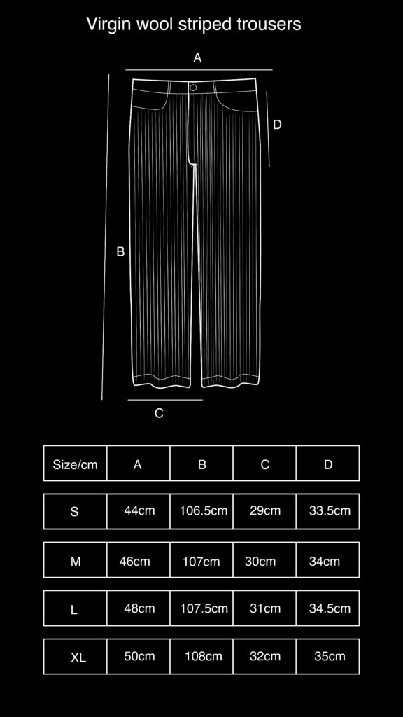 ITA:Un capo che unisce due mondi apparentemente distanti: la raffinatezza intrinseca della lana vergine e il carattere autentico del workwear tradizionale. I Virgin Wool Striped Pants reinterpretano il classico motivo gessato con un linguaggio contemporaneo, trasformando un simbolo di eleganza formale in un elemento di quotidiana sofisticazione.