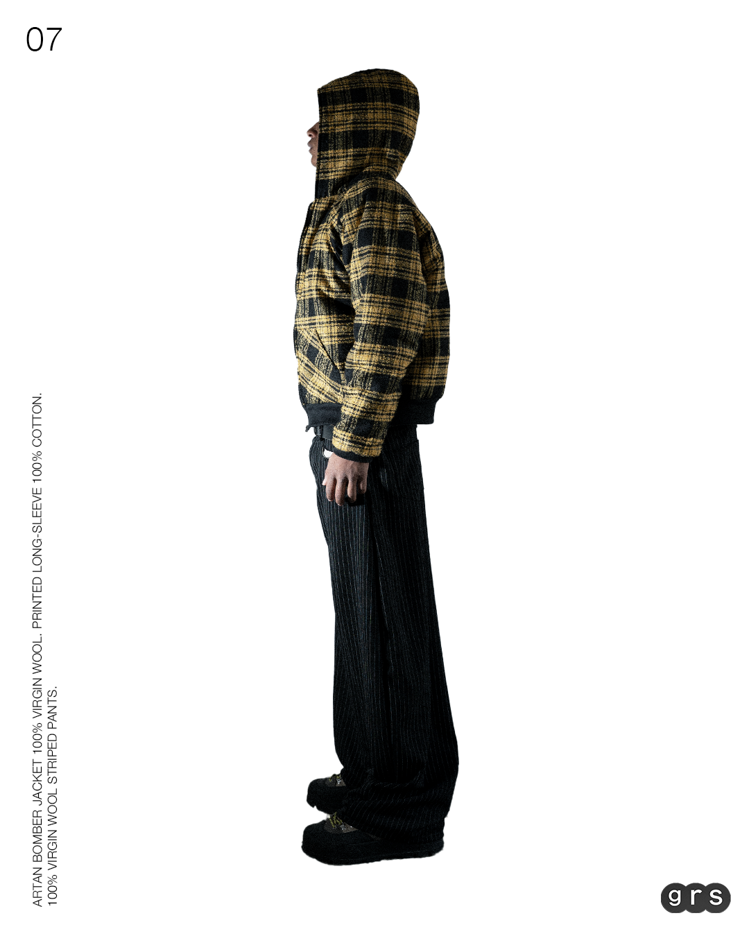 Il pattern gessato, reinterpretato con equilibrio e modernità, racconta una storia di contrasto e armonia: la disciplina della linea incontra la spontaneità del gesto artigiano. Ogni cucitura, ogni piega, ogni rifinitura è eseguita con cura millimetrica, restituendo un capo che parla di tempo, mestiere e cultura del fare.